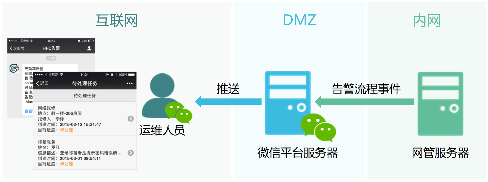 运维人员不在公司时,一旦产生与其相关的告警或流程事件,系统会在第一时间将相关信息通过微信运维平台推送给运维人员,避免因信息获取不及时耽误处理,导致更严重的后果,提高处理效率。